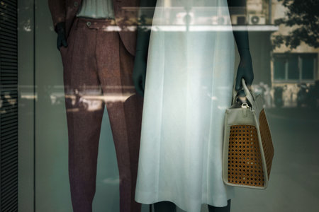 Details of a fashion store window, two mannequins representing the new spring-summer men's and women's collections.