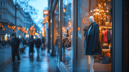 Elegant high-end boutique storefront featuring a mannequin in a sophisticated black coat, set against a vibrant urban shopping street at dusk with blurred pedestrians and warm lighting