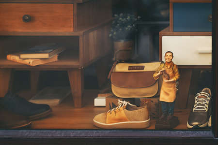 Vintage look of shop window with leather accessories and artisan figurine