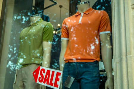 Boutique window with dressed male mannequins and Sale sign arrow on glass