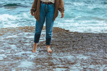 Unrecognizable woman walking on coast in the evening, view of legs near the sea