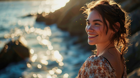 A woman smiles with the ocean and sky in the background. The image presents warm tones with natural sunlight. The composition is balanced with the subject in focus. This image could be used for various commercial or editorial purposes.
