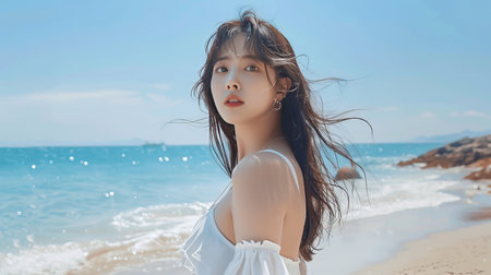 A young woman standing by the beach, wearing a flowing white dress. Her hair dances in the ocean breeze as she gazes into the distance, embodying beauty and serenity.
