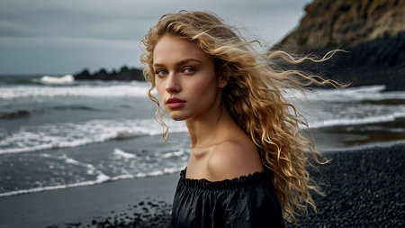 Portrait of a beautiful woman on a beach with black sand against the background of the sea. Romantic, calm and sensual photo of a girl in a delicate black dress.