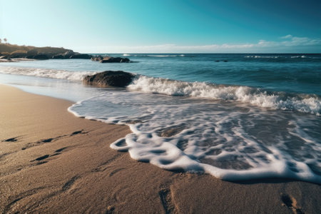 Beautiful ocean waves gently rolling onto a sandy shore, creating a serene coastal scene perfect for relaxation and tranquility during golden hour.