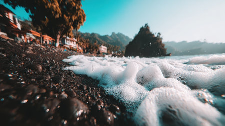 A close-up, ground-level perspective of white sea foam bubbling over dark, wet pebbles on a shoreline. In the distance, a coastal town and a large rock formation are visible.