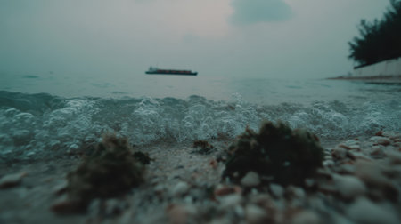 A detailed close-up shot of a foamy sea wave rolling onto a pebble beach under a cloudy sky, creating a tranquil and natural coastal landscape background.