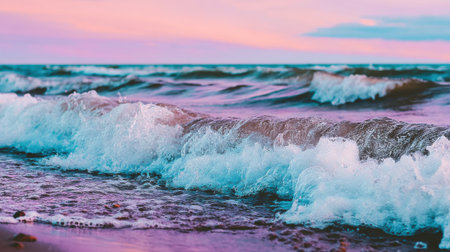 A close-up view of powerful sea waves with white foam breaking on the beach. The sky above is a beautiful gradient of pink and purple, reflecting on the waters surface.