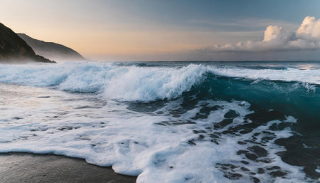 This breathtaking image showcases the natural beauty of foamy waves cascading onto a sandy beach, highlighting the dynamic energy and tranquility of the oceans turquoise waters beneath a