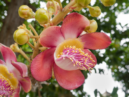 Cannonball flower of Cannonball Tree or Sal Tree, Beautiful round white magenta color flower,The plant in Buddhism history and typically be founded growing in Thai Temple area.