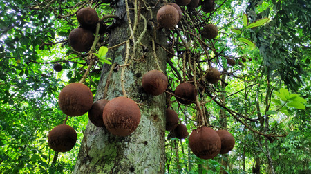 Fresh cannon ball fruits tree in garden, surrounded cannon ball fruit,