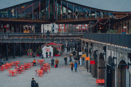 London, UK - January 01, 2022: People walking past the shops in Coal Drops Yard, a shopping destination and foodie hotspot near King's Cross St Pancras stations opened in 2018.