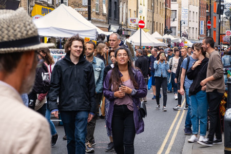 London, UK - December 29, 2019: People browse books at a market stall in Brick Lane, London. The street is the heart of the Londons Bangladeshi community and is famous for its curry houses.