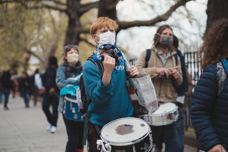 Westminster, London | UK - 2021.05.01: People with drums wearing masks at Kill the Bill protest.