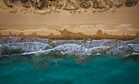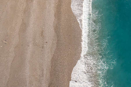 Beach Sand Sea Shore and waves white foamy summer sunny day background.Amazing beach top down view overhead seaside nature background