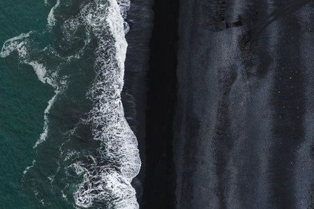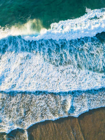 Aerial view of ocean waves crashing on black sand beach. Top view
