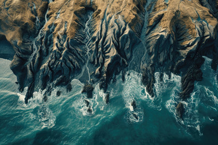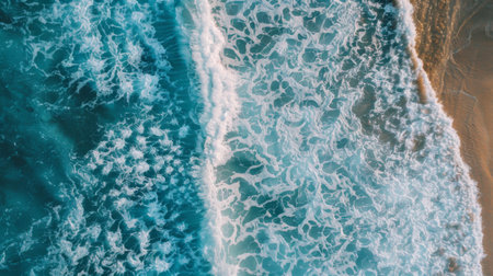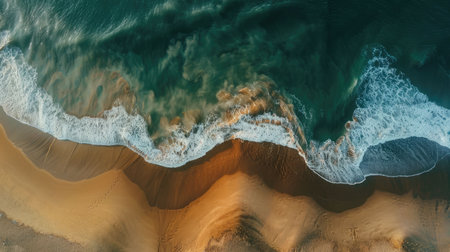 An aerial perspective of water waves crashing onto a sandy beach, showcasing a natural landscape with a stunning geological phenomenon in motion AIG50