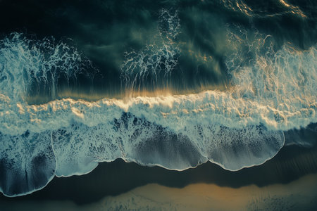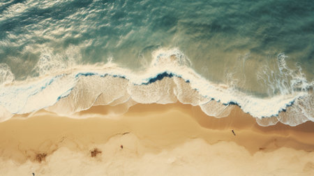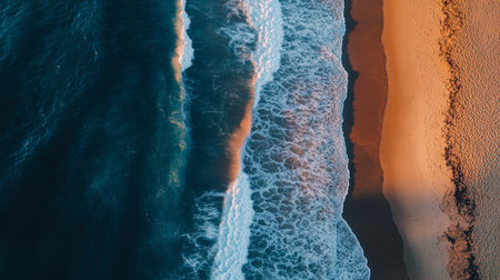 A stunning aerial shot of the ocean waves and sandy beach, with a soft illumination and a picturesque scenery