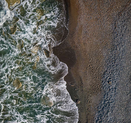 Green waves with white sea foam over dark sandy shore of chocolate color, top view texture