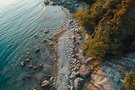 The tranquil shoreline at sunrise features smooth rocks and pebbles, interspersed with lush trees, reflecting peaceful nature by the water's edge.