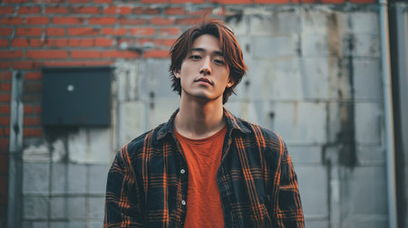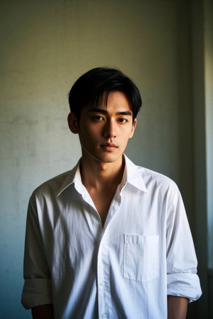 A young man stands confidently in front of a plain wall, showcasing his wavy, tousled hair and a subtle mustache. He gazes directly at the viewer, exuding a calm and contemplative demeanor. The soft lighting accentuates his features, creating a serene atmosphere that highlights the simplicity of the moment.