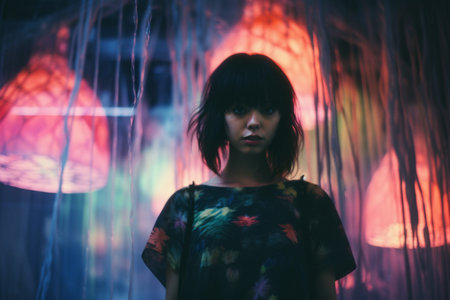 A girl smiles while surrounded by vibrant, swirling lights in a dynamic art installation during an evening festival celebrating creativity and innovation.
