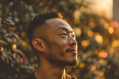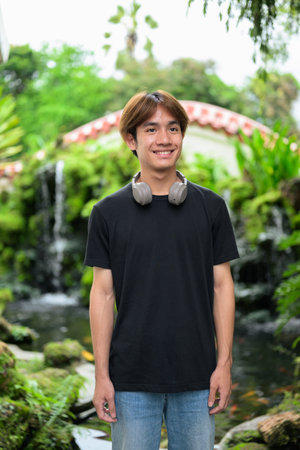 Young Thai Asian man in traditional Asian Zen garden during summer. Confident, relaxed, and authentic look suitable for various concepts and uses