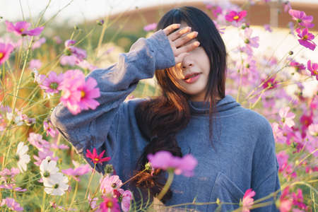 Asian girl looking at her mobile phone with serious expression in film tone colour style