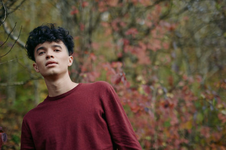 An authentic portrait of a young man in a burgundy sweater, standing in an autumnal grove with soft light, conveying real emotion and genuine self expression.