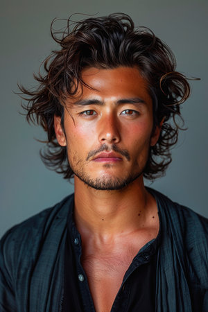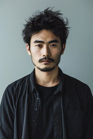 Portrait of young hadsome serious bearded Korean man on the gray background