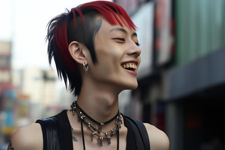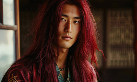 Portrait of young Asian man with deep red long hair in traditional clothes looking at camera