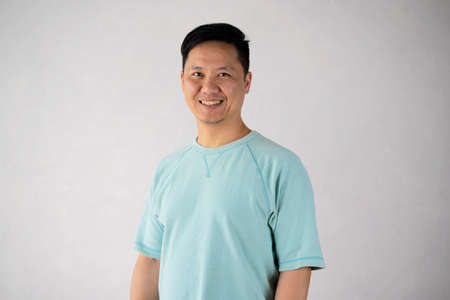 Portrait of self-confident middle age Asian man in a white t-shirt on grey background.