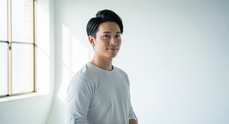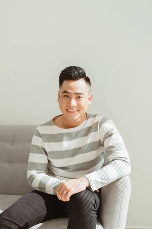 A joyful young Asian man beams with a radiant smile, showcasing his friendly demeanor against a calming blue backdrop. His relaxed posture and genuine expression evoke warmth and approachability, inviting connection and positivity.