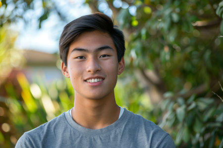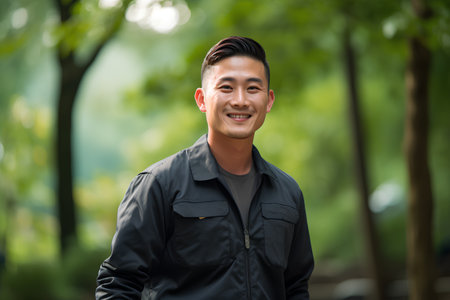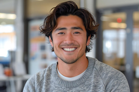 Friendly Asian man smiling. Young smart guy. Generate Ai