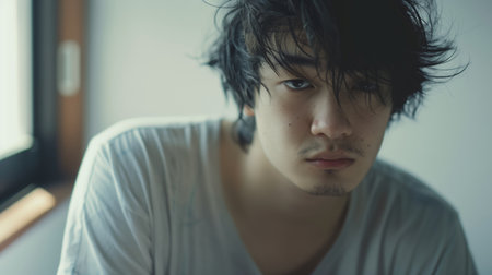 Indonesian male with wet hair deep in thought while sitting by the window.