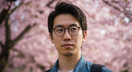 Portrait of Asian man looking at camera with pink cherry blossom background