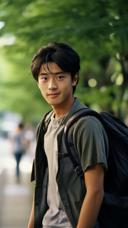Young Asian student with a backpack outdoors. Young refugee guy. Concept of immigrant education, refugee resilience, international education, diversity, and cultural integration. Vertical format