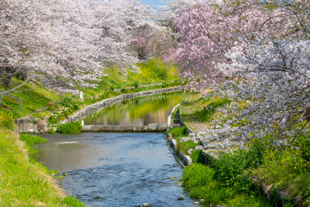 Takano river with cherry blossoms at spring in Kyoto, Japan
