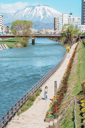 Beautiful Iwate mountain and Kitakami river with flowers blooming in Spring season, cityscape against blue sky in Morioka city, Iwate prefecture, Japan. famous Landmark Travel and Vacation destination