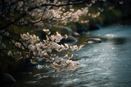 Cherry blossoms bloom along the river creating a romantic spring atmosphere at sunset