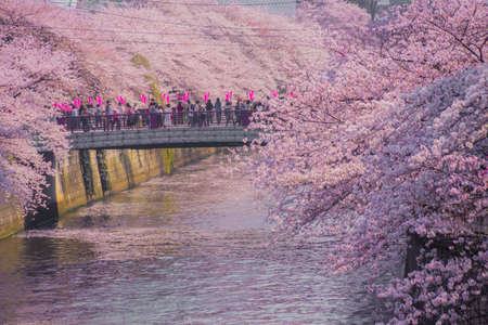 Cherry blossoms in Meguro River in full bloom. Shooting Location: Tokyo Meguro-ku