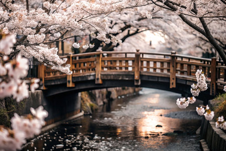 Cherry Blossom Bridge over Canal at Dawn