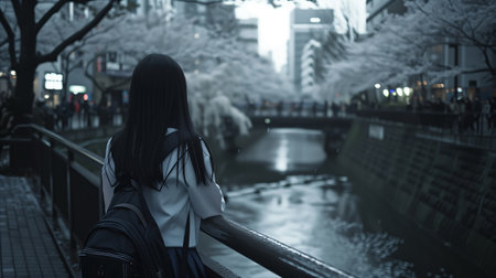 A thoughtful Japanese high school girl stands by a riverside, gazing into the distance. Her uniform suggests a moment after school in a peaceful urban setting.