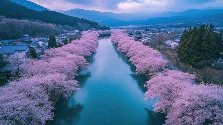 Aerial view of the Kannonjigawa River, surrounded by a stunning row of cherry blossoms in Inawashiro, Fukushima.