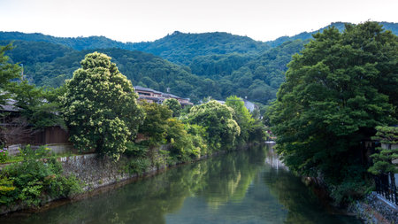 A landscape shot of a river in Kyoto during summer with a bridge visible in the distance