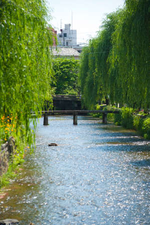 Kyoto, Japan - November 10, 2017 : willow trees(Salix) along Shirakawa river and Ippon bridge (ipponbashi). A narrow stone bridge near Chion-in Temple over the Shrikawa River. The bridge has no handrails