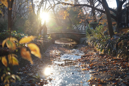 Serene park stream with a stone bridge, autumn foliage, and sunlight reflecting on the water, creating a peaceful atmosphere.