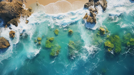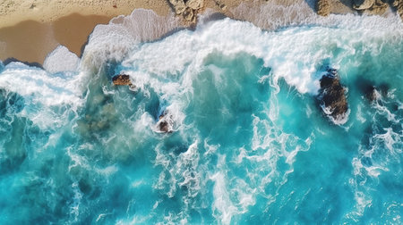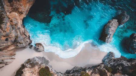 An exquisite image capturing the dynamic interaction between sea and land, ideal for travel and nature publications, environmental awareness campaigns, or as a calming piece for interior design | From an elevated vantage point, the photo depicts the mesmerizing beauty of turquoise ocean waves as they break upon a golden sandy beach, creating a foam-flecked boundary between the aqua of the sea and the earth-toned coastline. The clarity of the water reveals the sandy ocean floor, adding depth and transparency to the scene, while the rock formations provide a sense of rugged permanence amidst the ever-changing tides. The frothy white of the waves injects energy and movement into the otherwise serene landscape, with the foam patterns offering a natural, organic contrast to the smoothness of the sand. This composition reflects nature's intricate balance of power and tranquility, and the shoreline serves as a visual metaphor for transition and interface. Natural sunlight enhances the vibrancy of colors and the play of light and shadow, emphasizing textures and the beach's secure atmosphere | This image is perfect for environmental storytelling, illustrating the raw beauty of secure beaches, and has potential for use by travel agencies promoting exotic destinations. It can enrich articles about coastal conservation or serve as a peaceful backdrop in spas and wellness centers. It can also provide a tranquil visual for those seeking inspiration from nature's splendor or for use in educational materials about maritime geography | a high-definition drone-captured photo showing casing a pristine beach and crashing waves, detailed with the contrasts between water, sand, and stone under bright natural light, suitable for wide-ranging narrative and visual applications