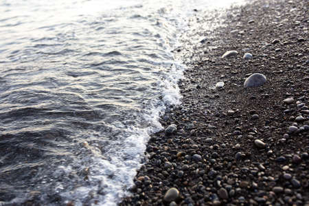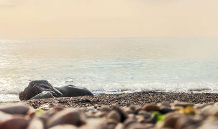 Pebble beach in perspective, close-up. Seashore in spring.Focus on the wet gravel