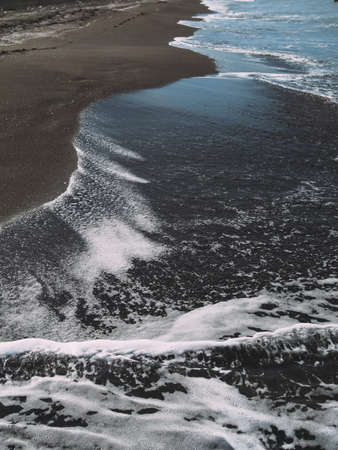 Aerial view of ocean waves crashing on black sand beach. Top view